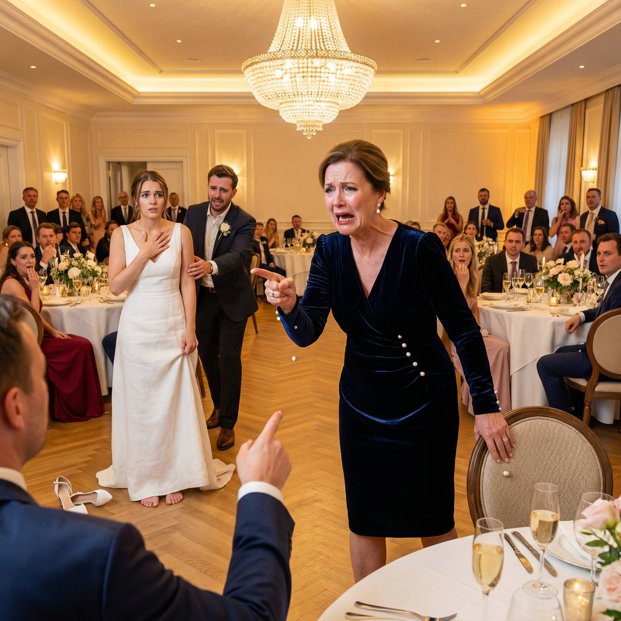 Она обвела взглядом зал — и увидела то, что осталось от её парадного вечера. Жених, ушедший за женой. Гости, не знающие, куда смотреть. И мать жениха — немолодая женщина в тёмно-синем бархате, с перекошенной брошью, одна под слишком яркой люстрой.