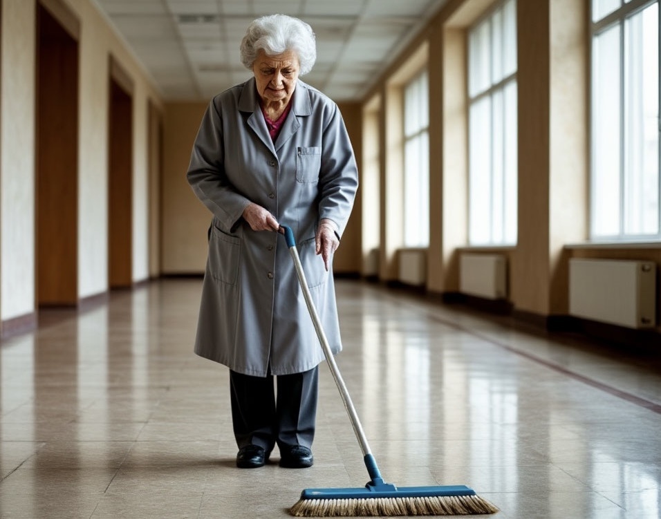Так я работала здесь уже четыре месяца. Убираю с семи утра до трёх дня. Вестибюль, два коридора на первом этаже, туалеты. Иногда просят помочь на втором — там конференц-залы, их моют перед совещаниями. Платят двадцать три тысячи. Не густо, но мне хватает. Я живу одна, квартира своя, огород на даче кормит летом. На хлеб остаётся.
