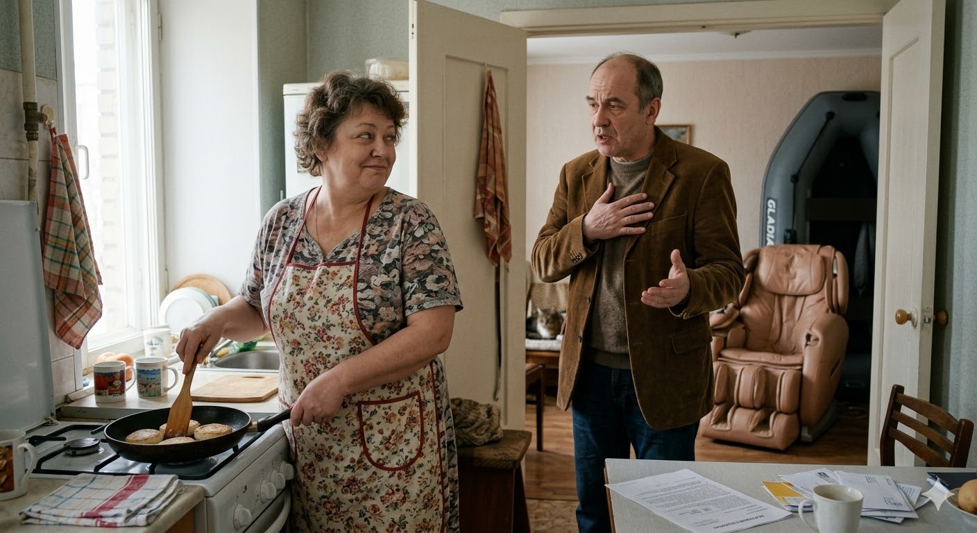 Марина стояла у плиты и методично переворачивала румяные сырники. Сковорода тихонько шипела, по кухне плыл уютный аромат творога и ванили. Именно в эту идиллию, словно ледокол в тихую гавань, вплыл Валерий. Ему было пятьдесят восемь, он носил элегантную, но слегка потертую на локтях вельветовую куртку и выражение лица непонятого миром философа.