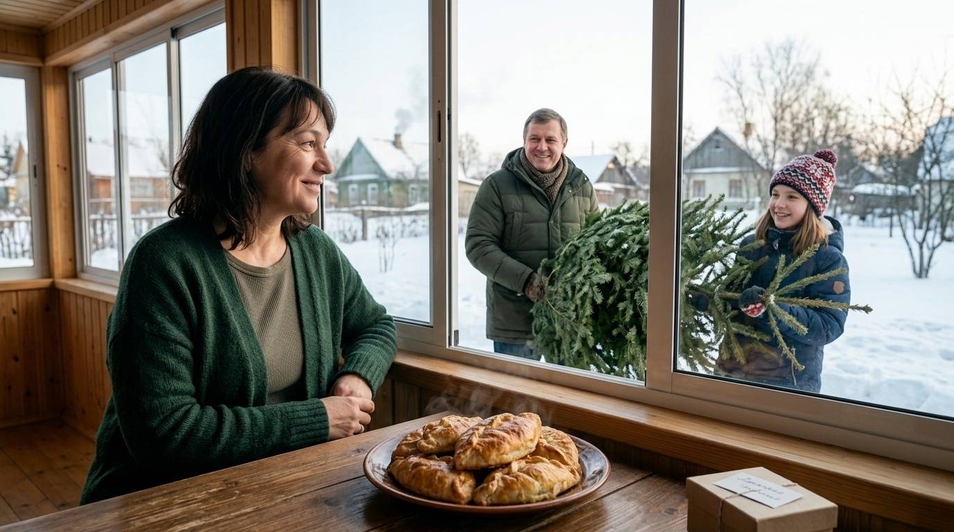 — Мама, мы ёлку принесли! — кричит Соня, смеясь и отряхивая варежки. — Самую пушистую в лесу выбрали!