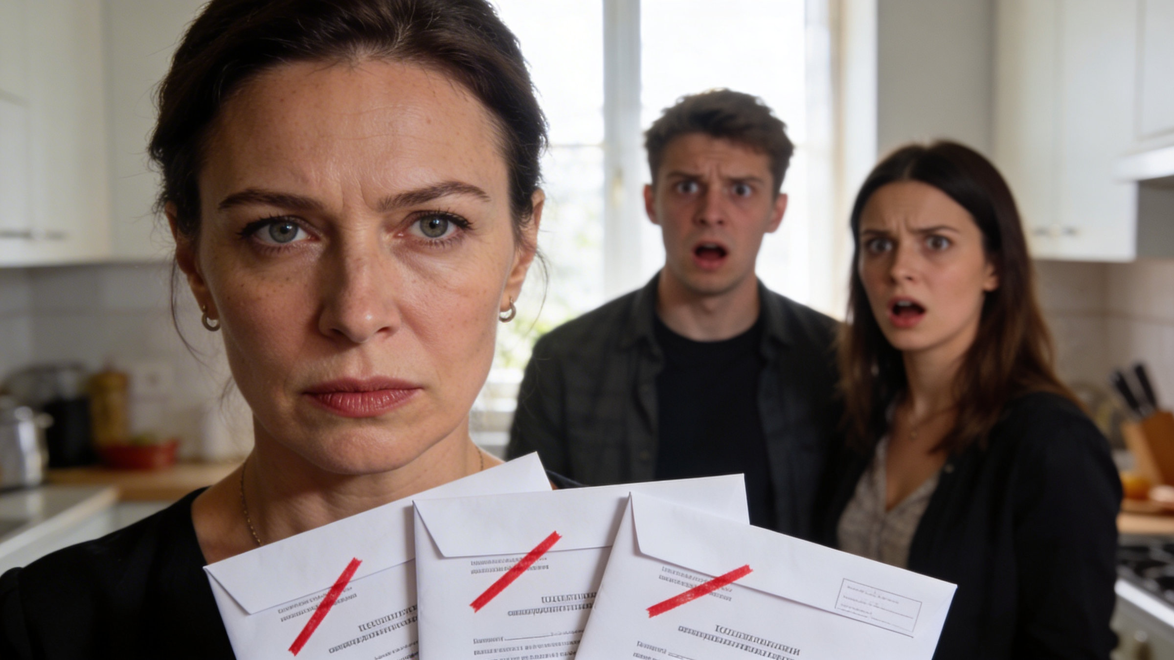 Елена взяла со стола три конверта и бросила их прямо перед родственниками. Конверты с легким шелестом скользнули по гладкой поверхности стола и остановились у локтя Максима.