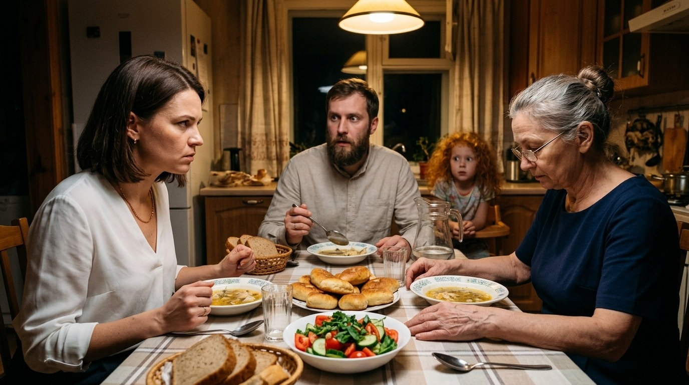 Тишина повисла такая, что стало слышно, как за стеной течёт вода по трубам. Сергей перестал жевать. Арина смотрела то на мать, то на бабушку, широко раскрыв глаза.