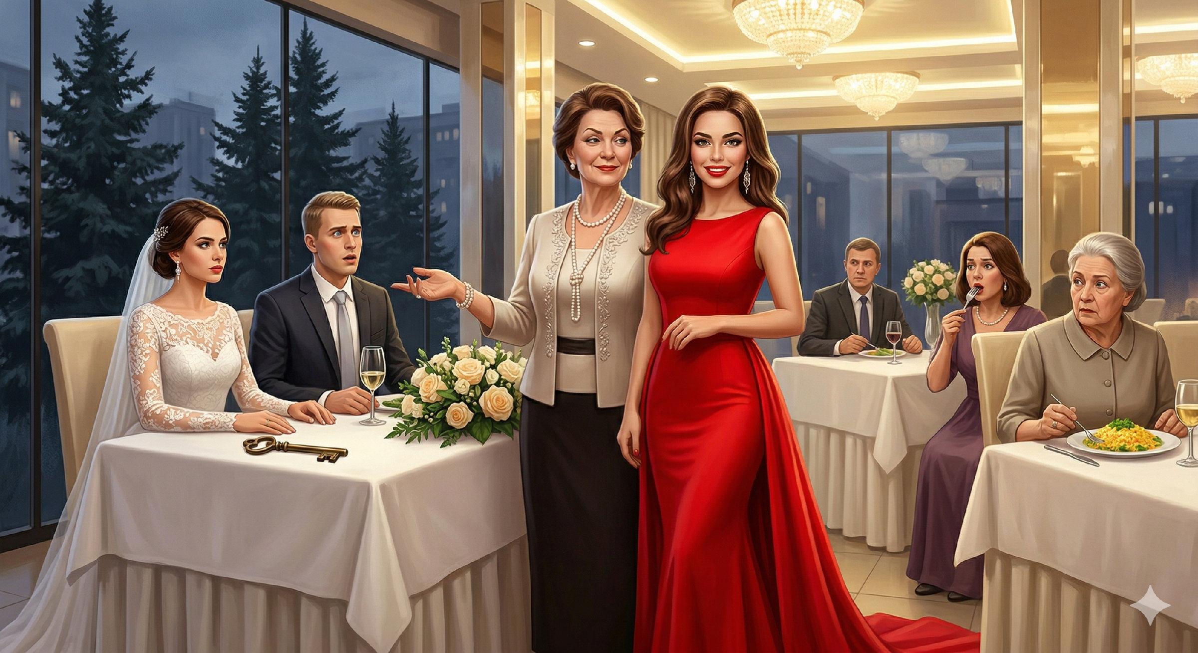 Это не был официант. Это не был запоздавший гость. В зал вошла женщина в красном. Я видела такие платья — они созданы не для того, чтобы в них ходили, а для того, чтобы в них объявляли войну. Элеонора Аркадьевна тут же встала, будто у неё под сиденьем сработала пружина.