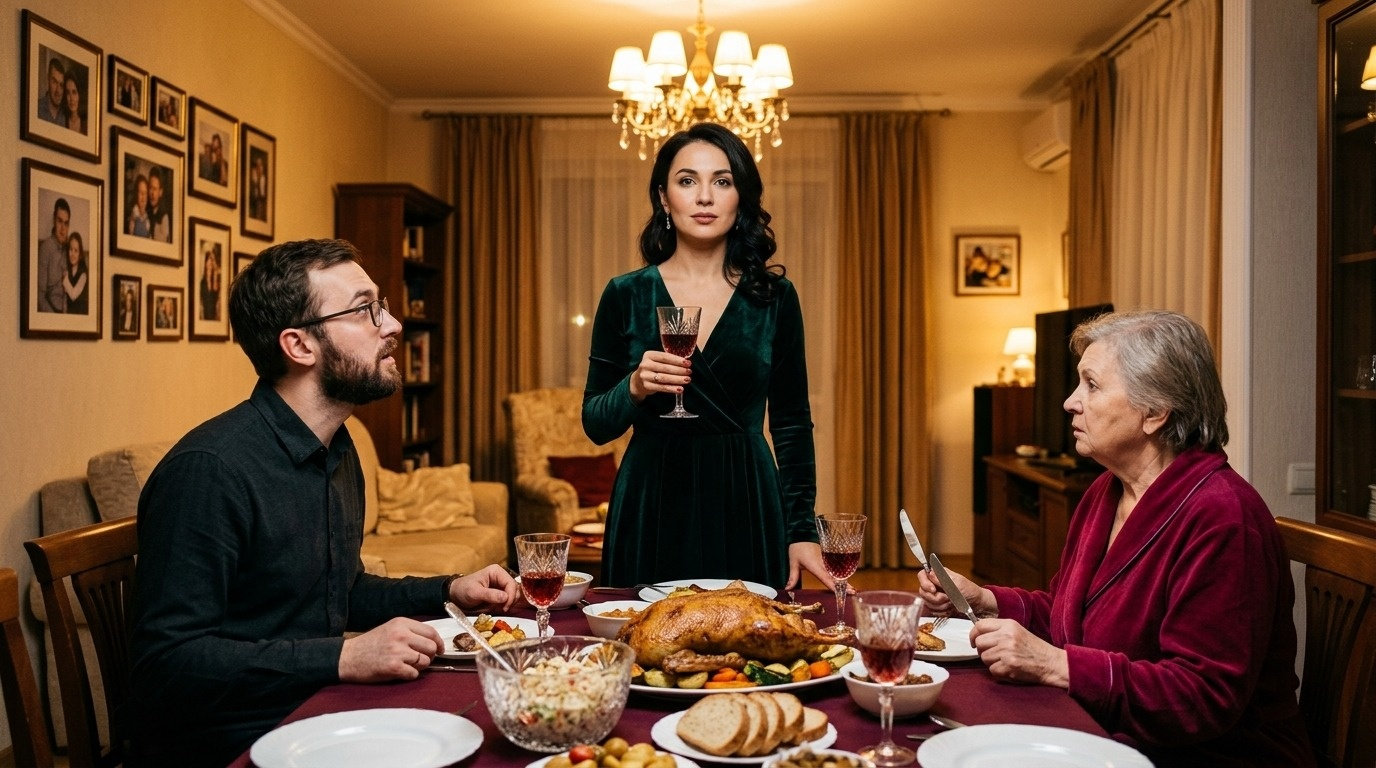 Стол в квартире свекрови ломился. Гусь, сияющий жиром, салаты в хрустальных вазах, домашние соленья. Раиса Петровна суетилась в новом плюшевом домашнем костюме цвета бургунди. Она была в своей стихии. Царица пира.