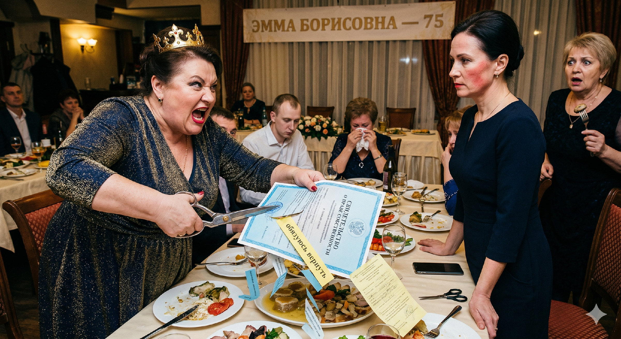 Лариса отбросила ножницы. Те звякнули о фужер, издав тонкий, жалобный звук. Свекровь, Эмма Борисовна, чьи семьдесят пять мы сегодня так «весело» отмечали, вдруг всхлипнула.