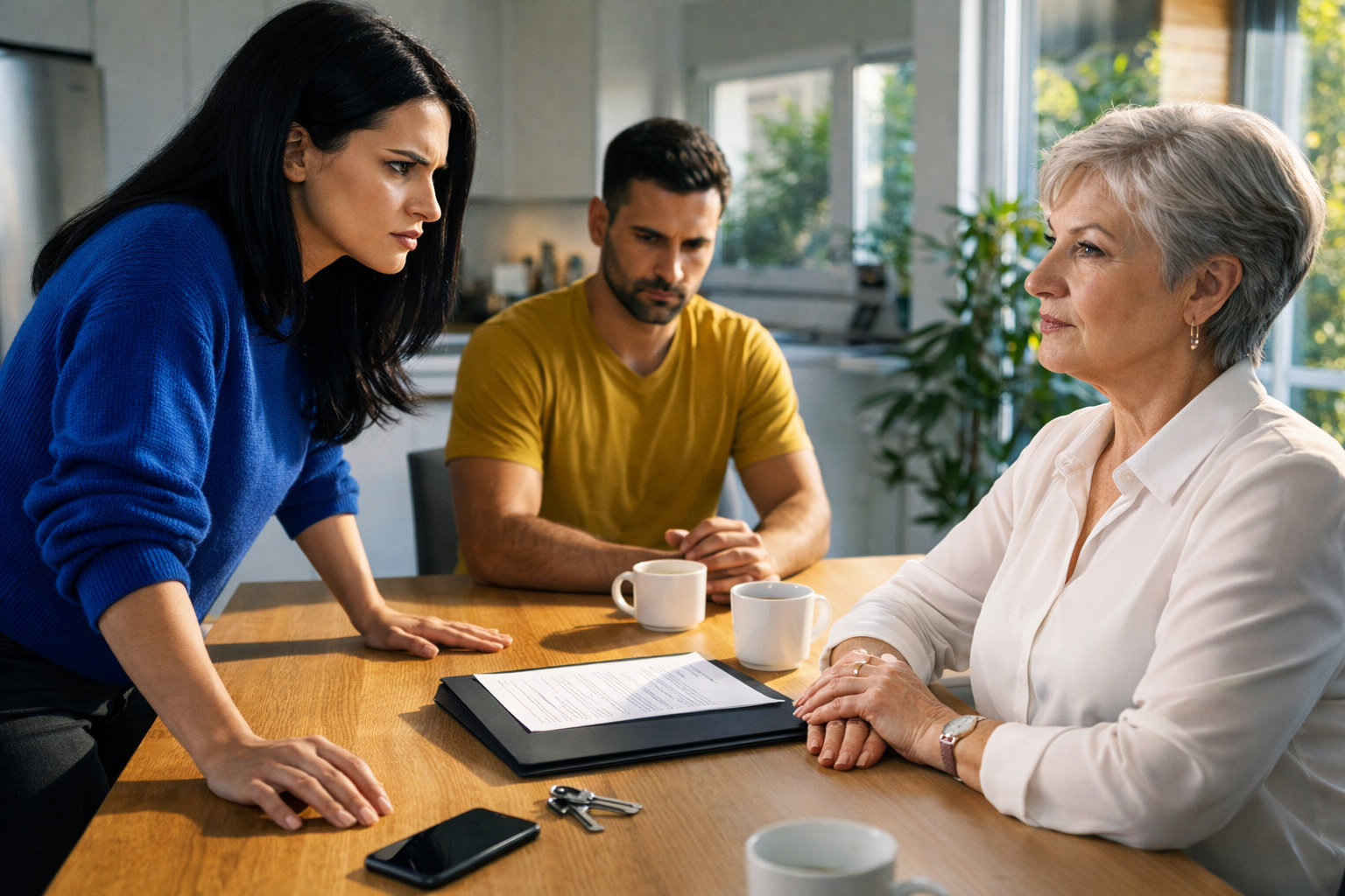 Алина ещё не успела снять куртку. Ключи лежали у неё в ладони, сумка давила на плечо, а в кухне, за столом, будто ничего особенного не происходило. Муж сидел боком к двери, положив локти на столешницу, а рядом с ним Вера Павловна перебирала бумаги с таким видом, словно выбирала ткани на новые чехлы, а не решала что-то, напрямую касавшееся чужой квартиры.