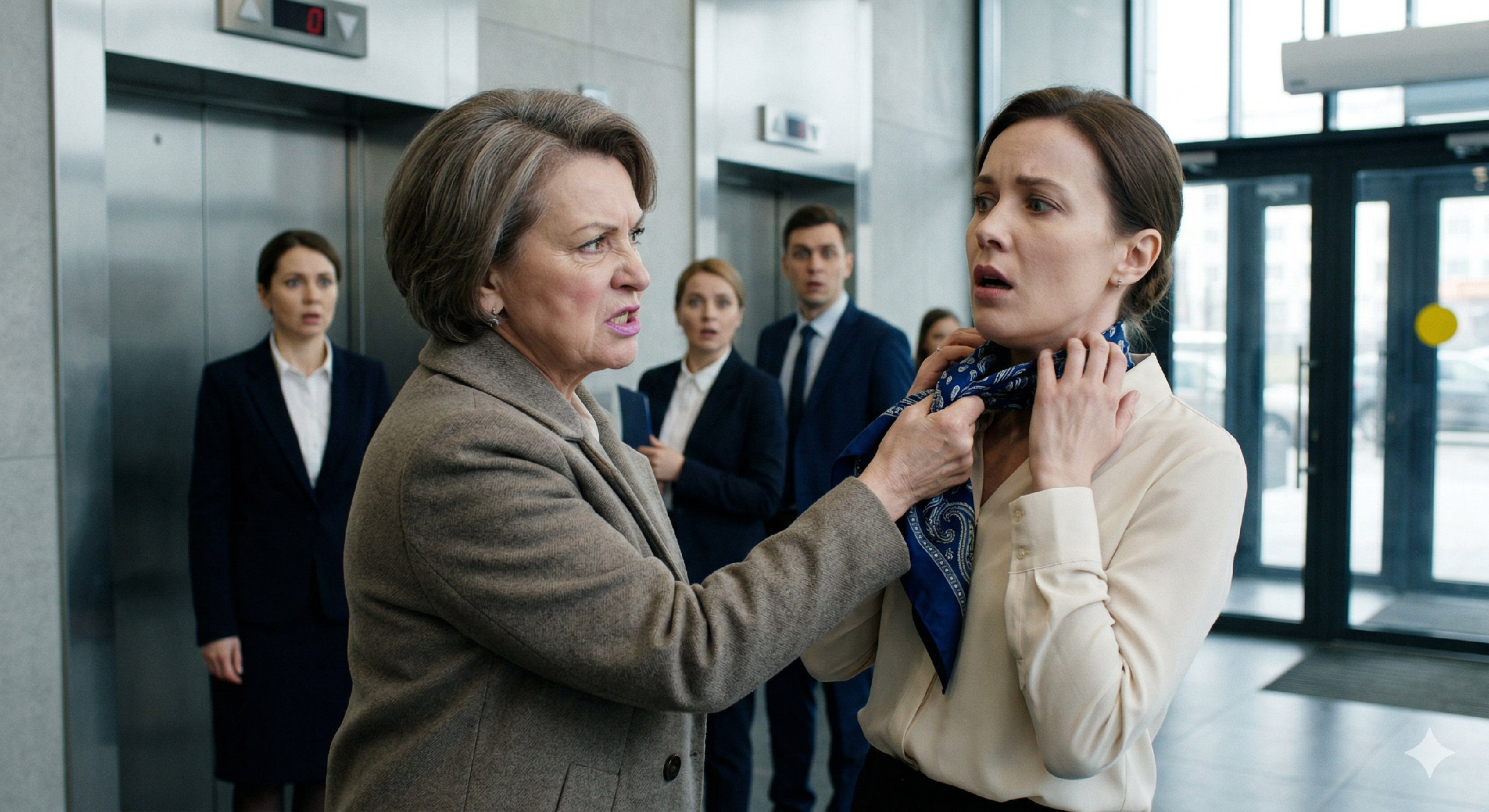 Я почувствовала, как шелк натянулся, больно врезаясь в горло. Рядом замерли Марина из бухгалтерии и наш новый айтишник, кажется, Артем. Они смотрели во все глаза. Я медленно подняла руки, пытаясь ослабить хватку Риммы Львовны, но она дернула сильнее. Узел поддался, и мой любимый синий шарф, тот самый, с «огурцами», который я купила себе на первую премию, оказался в её кулаке.