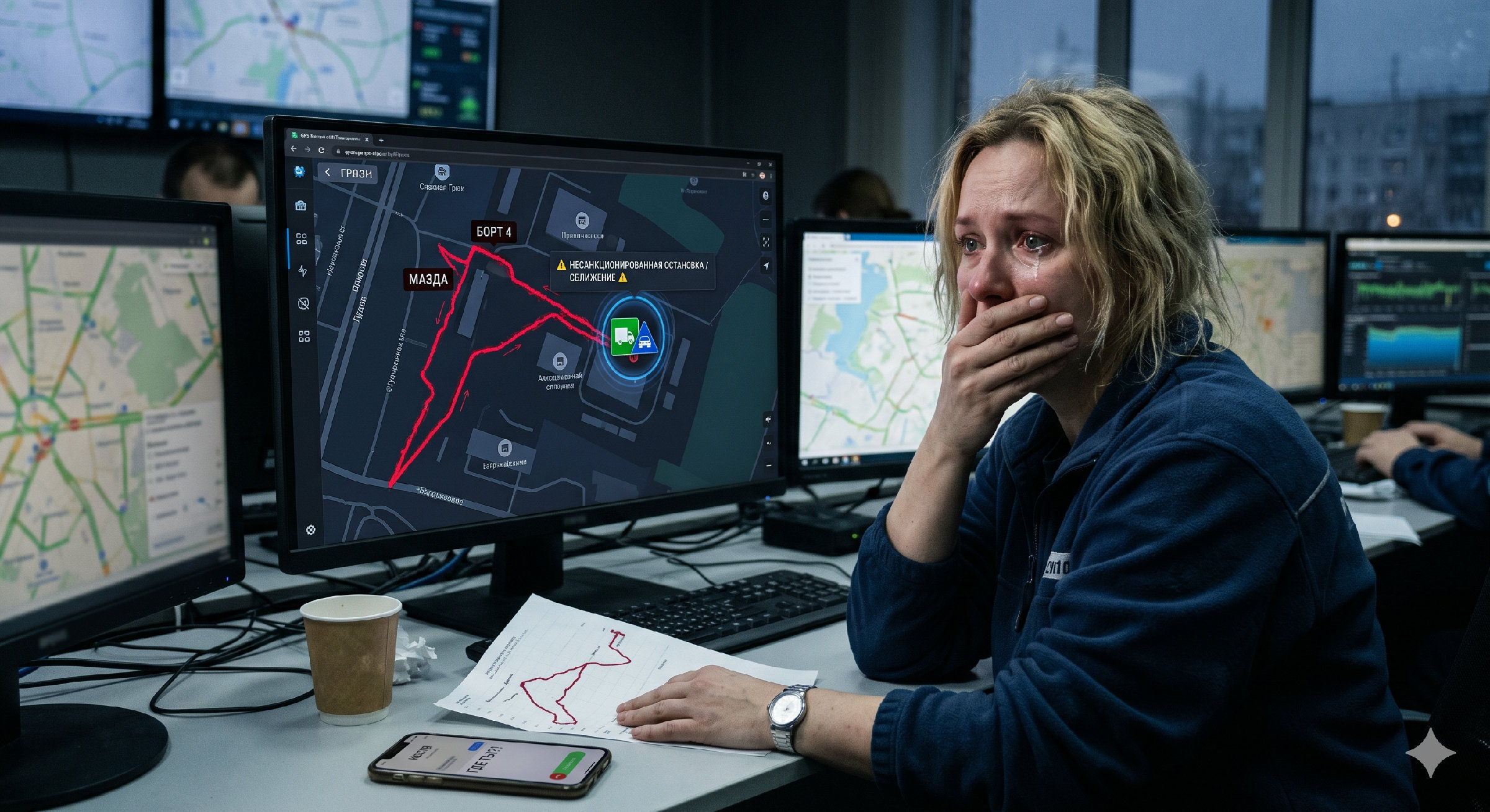 В офисе пахло дешёвым кофе и озоном. Мониторы светились холодным голубым светом. Я села на место Семёнова, ввела пароль. На карте Липецкой области рассыпались маркеры. Зелёные — в пути, синие — стоянка, красные — отклонение от маршрута.